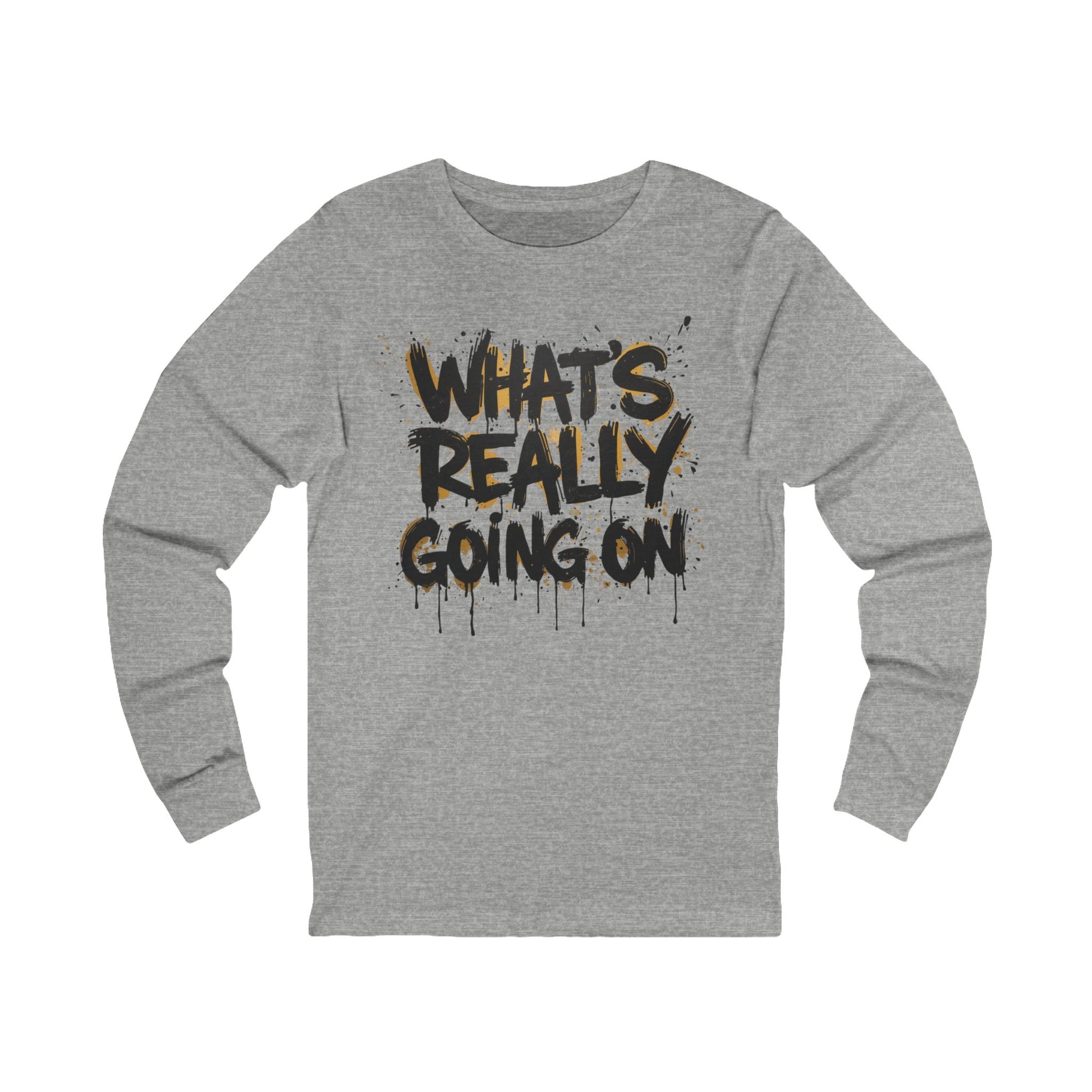 Featuring graffiti-style black lettering outlined in gold drips, it’s a wearable wake-up call. The design asks the question loud and raw — WHAT’S REALLY GOING ON — and leaves space for truth to rise.
